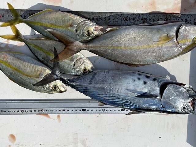 【釣り人】度会郡 山口侑記さん【釣 果】シオ 40.2cm 1匹 ヤイトガツオ 40cm 1匹 シマアジ 24cm~26.2cm 3匹【釣り方】ルアー釣り【水 温】23.8度 【海 上】高波 【 潮 】上り・下り・速い &n... -