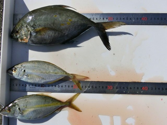 【釣り人】神戸市 高橋保洋さん【釣 果】カイワリ 34.7cm 1匹 シマアジ 2匹 【釣り方】フカセ釣り【水 温】25.8度 【海 上】高波 【 潮 】上り・遅い -