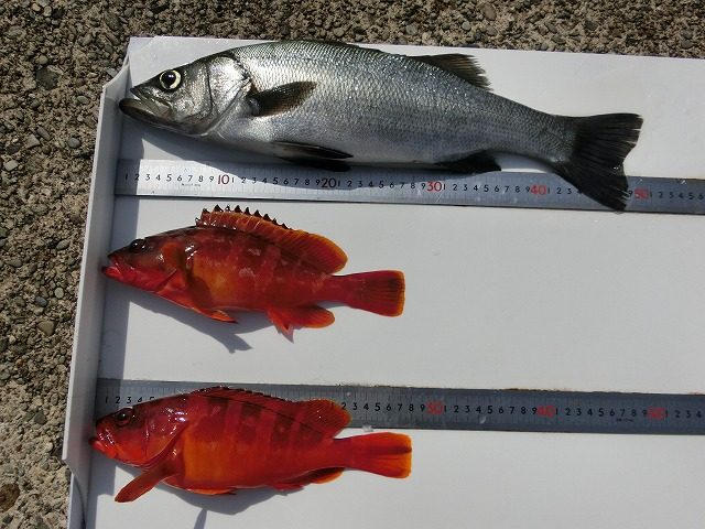 【釣り人】小牧市 豊田幸輔さん【釣 果】ヒラスズキ 51cm 1匹 アカハタ 27.5cm~28cm 5匹【釣り方】ルアー釣り【水 温】17.9度 【海 上】高波 【 潮 】下り・遅い -