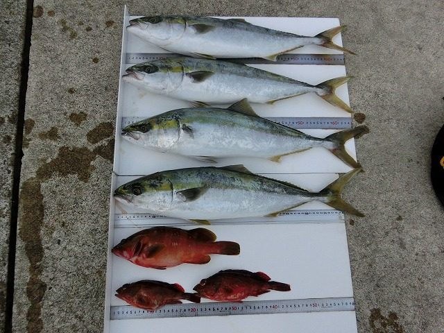 【釣り人】揖斐郡 若原久和さん 【釣 果】ワラサ 67cm~70cm 4匹 アカハタ 33cm 1匹 ガシ 20.7cm~25cm 2匹 【釣り方】ルアー釣り 【水 温】19.2度 【海 上】ナギ~多少波 -