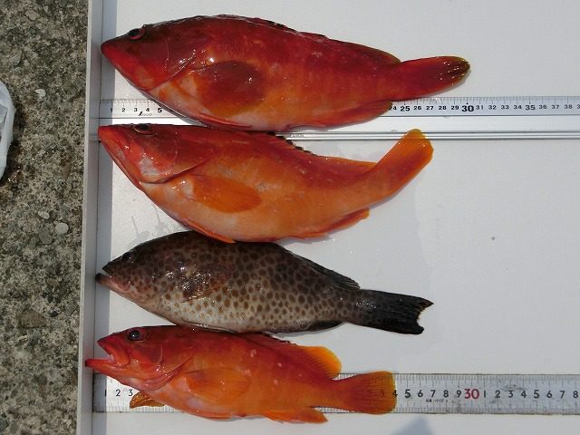 【釣り人】知多市 新海達也さん 【釣 果】アカハタ 24cm~30cm 3匹 オオモンハ 27cm 1匹 【釣り方】ルアー釣り 【水 温】29.0度 【海 上】ナギ 【 潮 】下り・速い 【釣り人】神戸市 高橋保... -