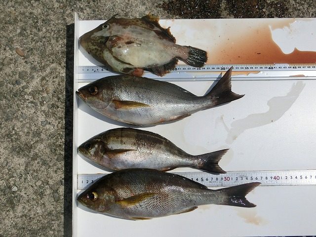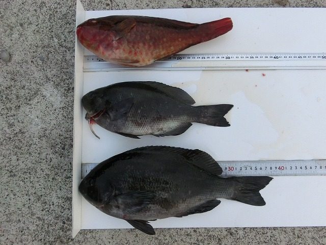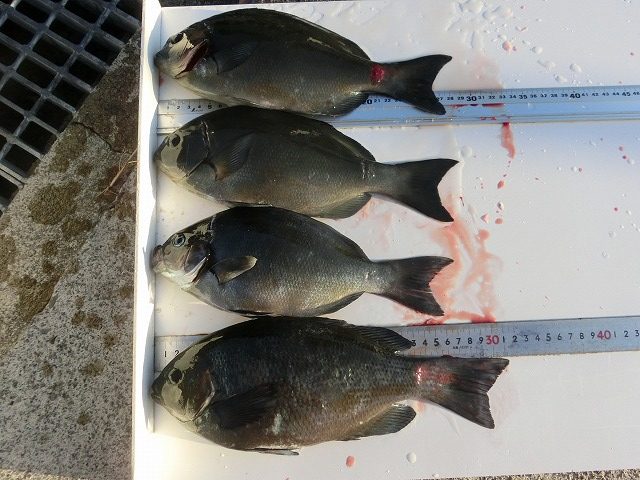 【釣り人】交野市 葛平雅也さん 【釣 果】ぐれ 31.5cm~38.5cm 2匹 イガミ 31cm 1匹 【釣り方】フカセ釣り 【水 温】21.8度 【海 上】ナギ 【 潮 】上り・遅い