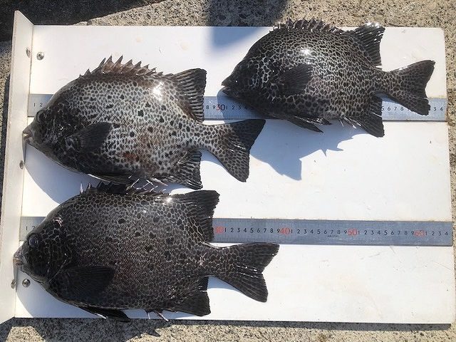 【釣り人】東大阪市 田中良明さん 【釣 果】イシガキ 34cm~39.5cm 3匹【釣り方】底物釣り【水 温】23.2度 【海 上】多少波 【 潮 】下り~上り・速い