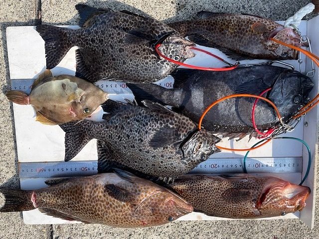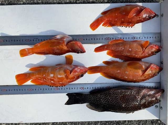 【釣り人】泉大津市 中嶋 徹さん【釣 果】アカハタ 24.5cm~28.5cm 5匹 オオモンハタ 37.5cm 1匹 【釣り方】ルアー釣り【水 温】22.6度 【海 上】ナギ 【 潮 】遅い -