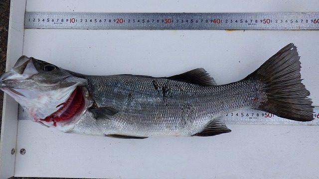 【釣り人】名古屋市 河合洋平さん 【釣 果】ヒラスズキ 55cm 1匹 【釣り方】ルアー釣り【水 温】度 【海 上】高波 【 潮 】下り・速い -
