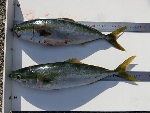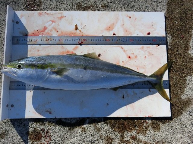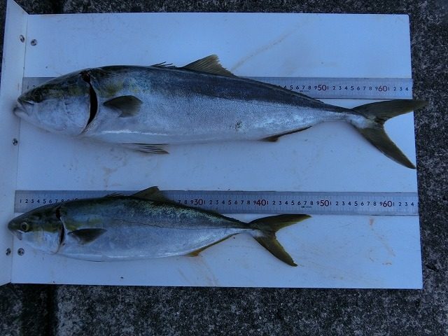 【釣り人】大阪市 横山正治さん【釣 果】ハマチ 43.5cm~48cm 2匹 【釣り方】フカセ釣り【水 温】19.6度 【海 上】高波 【 潮 】下り・遅い -