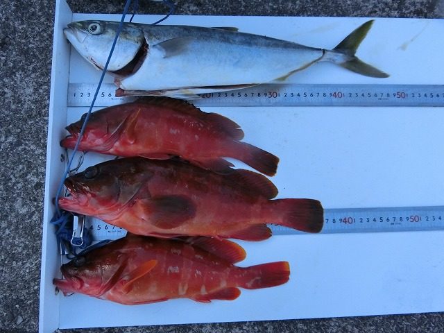 【釣り人】小牧市 豊田幸輔さん ワラサわ釣りあげましたが、フィッシュグリップからハズレ磯の上から海に、サヨナラ・・・・【釣 果】アカハタ 30.5cm~36.7cm 3匹 ハマチ 49cm 1匹【釣り方】ルアー釣り【水 温】20.... -