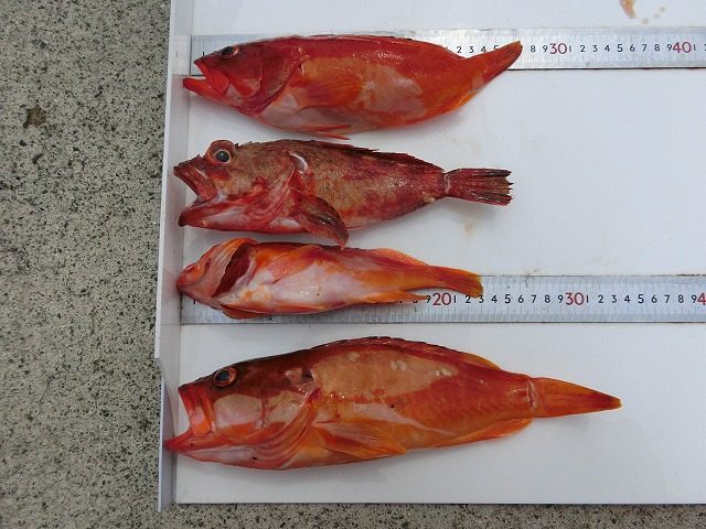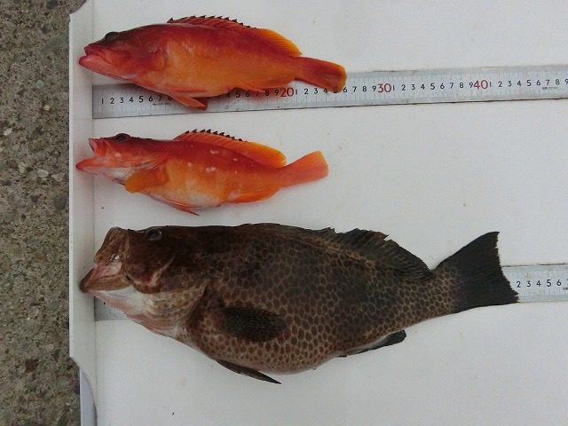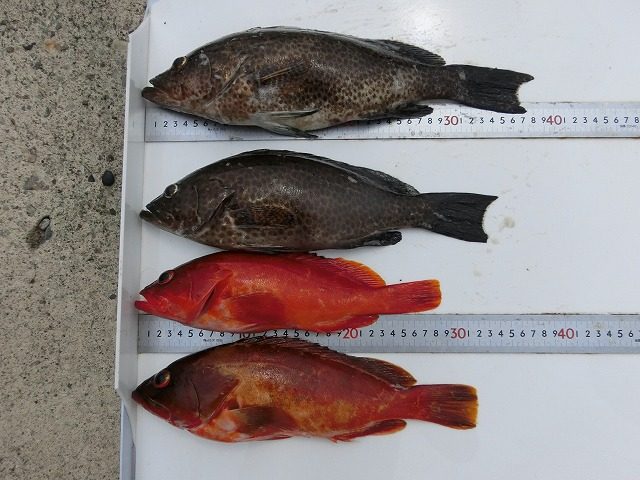 【釣り人】西宮市 新谷健一さん。【釣 果】オオモンハ 35cm~38cm 2匹 アカハタ 28.5cm~32cm 2匹 アカハタ、小さいサイズが20匹釣れましたが全部リリースしてきました。【釣り方】ルアー釣り 【水 温】25.0度 ... -
