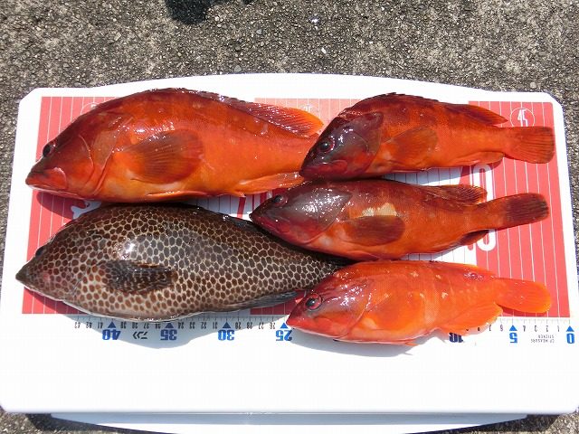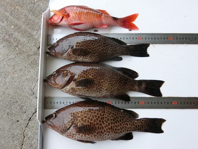 【釣り人】甲賀市 西田優介さん【釣 果】アカハタ 23.5cm~34cm 4匹 オオモンハタ 34cm 1匹 【釣り方】ルアー釣り【水 温】21.9~23.0度 【海 上】高波~多少波 【 潮 】下り~上り・速い -