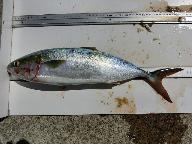 【釣り人】鈴鹿市 大井 真さん 中層でヒット !! 【釣 果】ハマチ 51cm 1匹 【釣り方】ルアー釣り 【水 温】16.5度 【海 上】ナギ 【 潮 】上り -