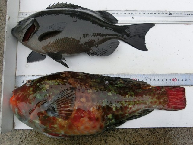 【釣り人】奈良市 大久保善夫さん 高波の中、頑張ってくれました。 【釣 果】ぐれ 42.5cm 1匹 尾長 28cm 1匹 【釣り方】フカセ釣り 【水 温】15.5度 【海 上】高波 【 潮 】下り・速い -