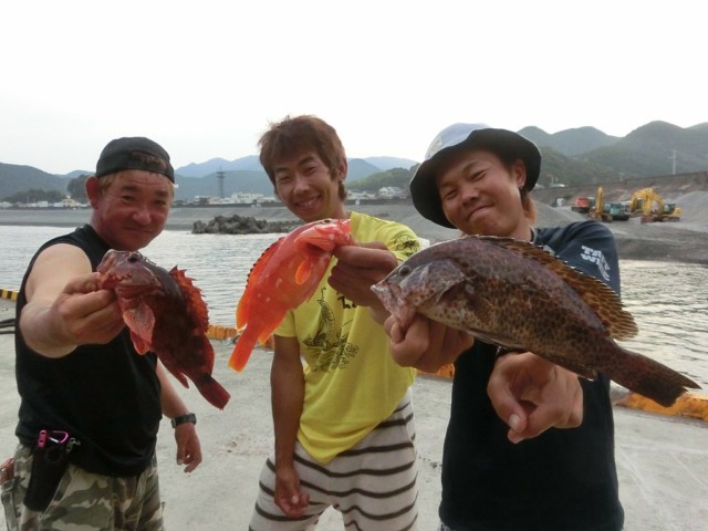 半夜釣り 【釣り人】南牟婁郡 生駒久貴さん、幸田樹典さん、岡本 光さん 【釣 果】アカゴロ 20cm~26cm 10匹 アズキマス 35cm 1匹 ガシ 20cm~27cm 6匹 【釣り方】ルアー釣り 【水 温】24.9~25.9度 【海 上】ナギ 【... -
