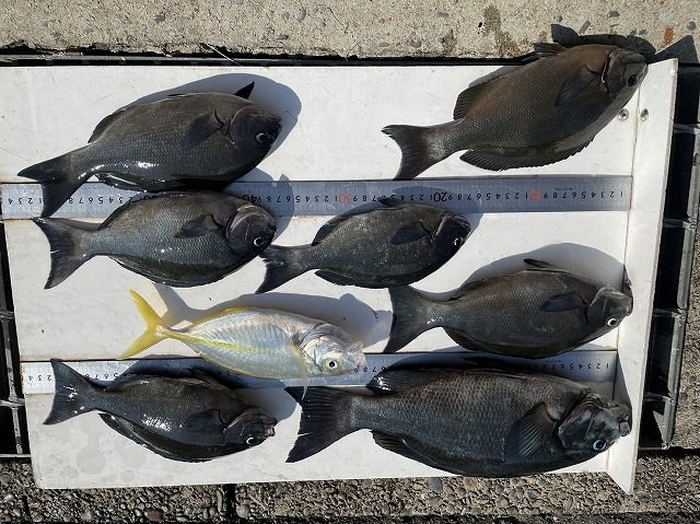 【釣り人】木津川市 柳 めぐみさん【釣 果】尾長 6匹 ぐれ 38cm 1匹 シマアジ 1匹【釣り方】フカセ釣り【水 温】24.3度 【海 上】多少波 【 潮 】上り・速い -