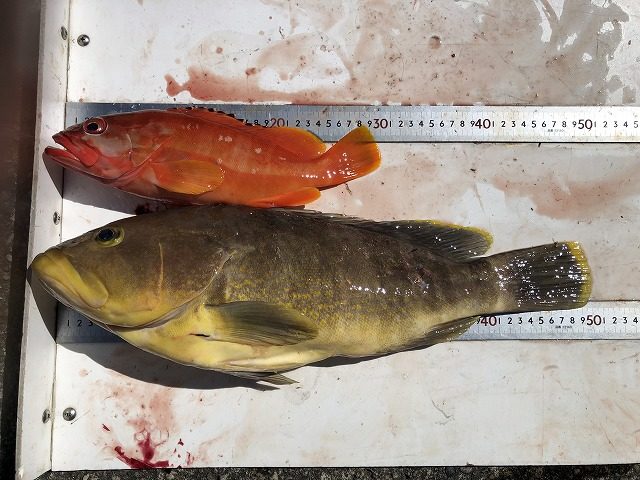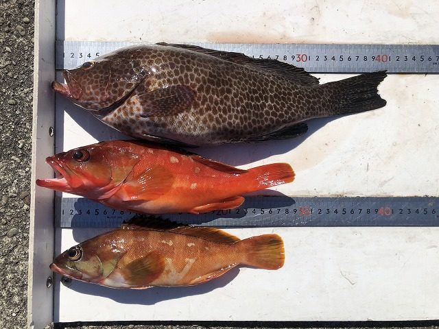 【釣り人】鈴鹿市 大井 真さん 【釣 果】オオモンハタ 41cm 1匹 アカハタ 27.5cm~29cm 2匹【釣り方】ルアー釣り 【水 温】28.1度 【海 上】ナギ 【 潮 】下り・速い 【釣り人】橿原市 堀川達也さ... -