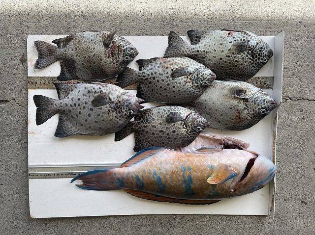 【釣り人】枚方市 岡南次郎さん 【釣 果】イシガキ 25cm~28cm 6匹 ヒブダイ 50cm 1匹 【釣り方】底物釣り【水 温】27.5度 【海 上】ナギ 【 潮 】下り・遅い -