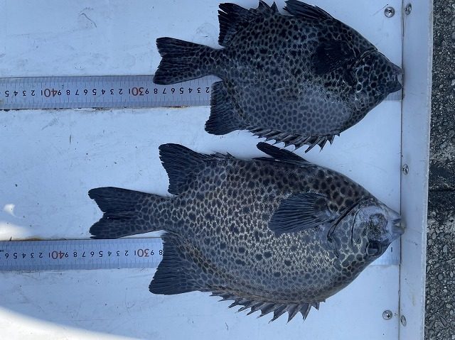 【釣り人】東大阪市 田中良明さん 【釣 果】イシガキ 28.5cm~36.5cm 2匹【釣り方】底物釣り【水 温】25.8度 【海 上】多少波 【 潮 】上り・遅い -