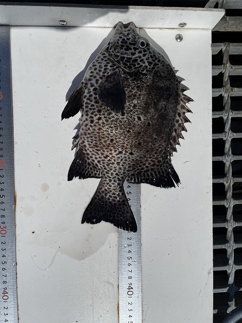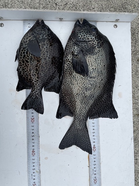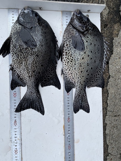 【釣り人】東大阪市 田中良明さん 【釣 果】イシガキ 29cm~42cm 2匹【釣り方】底物釣り 【水 温】度 【海 上】高波 【 潮 】下り・速い -