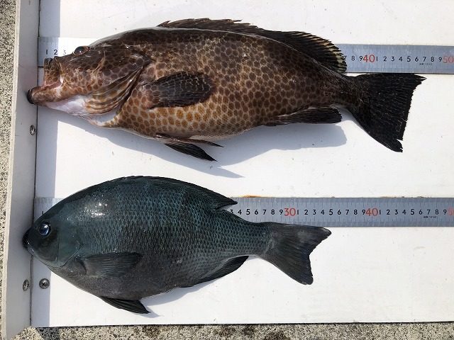 【釣り人】名張市 石橋健良さん【釣 果】ぐれ 35.1cm 1匹 オオモンハタ 47.5cm 1匹【釣り方】フカセ釣り 【水 温】16.1度 【海 上】多少波 【 潮 】下り・遅い