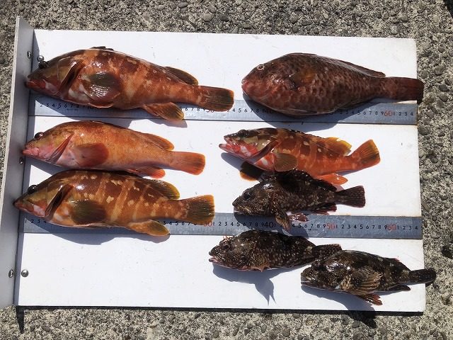 【釣り人】名張市 石橋健良さん【釣 果】アカハタ 26.5cm~34cm 4匹 イガミ 31cm 1匹 ガシ 3匹【釣り方】フカセ釣り【水 温】度 【海 上】多少波 【 潮 】下り・遅い -