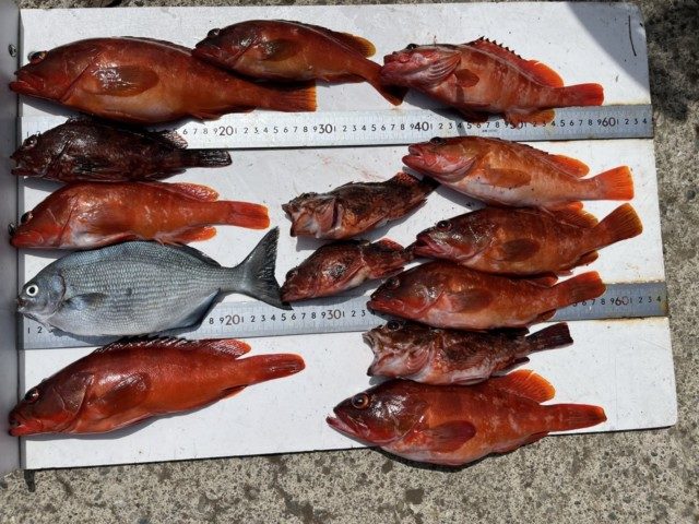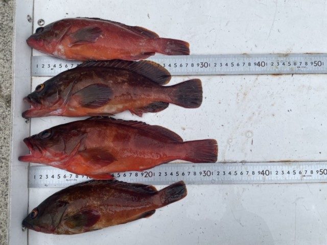 【釣り人】豊田市 服部博二さん【釣 果】アカハタ 22.5cm~29.2cm 9匹 ガシ 【釣り方】ルアー釣り【水 温】19.6度 【海 上】高波~多少波 【 潮 】上り・速い -