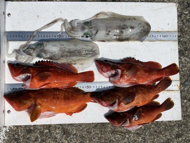 【釣り人】八尾市 宮田明典さん 【釣 果】アオリイカ 700g~800g 2杯 アカハタ 27.5cm~36.7cm 5匹 【釣り方】ヤエン釣り。アカハタは、フカセ釣りで。【水 温】19.6度 【海 上】高波~多少波 【 潮 】上り・遅い... -