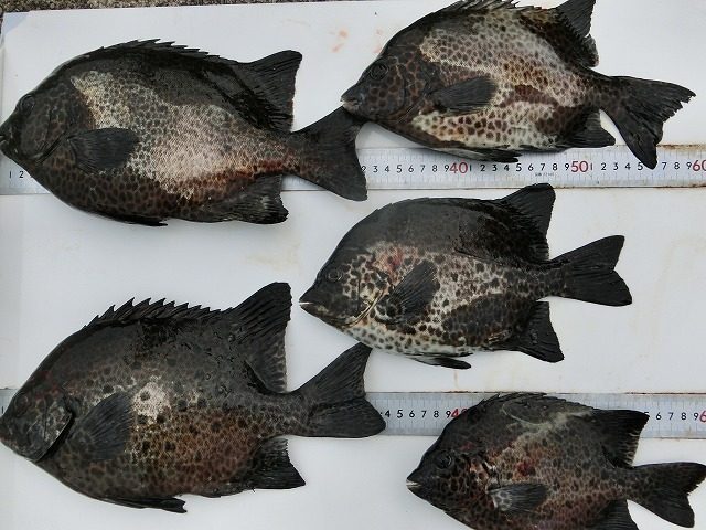 【釣り人】堺市 橋埜雅晴さん 【釣 果】イシガキ 23.5cm~34.2cm 5匹 【釣り方】底物釣り 【水 温】25.6度 【海 上】ナギ~多少波 【 潮 】下り・速い -